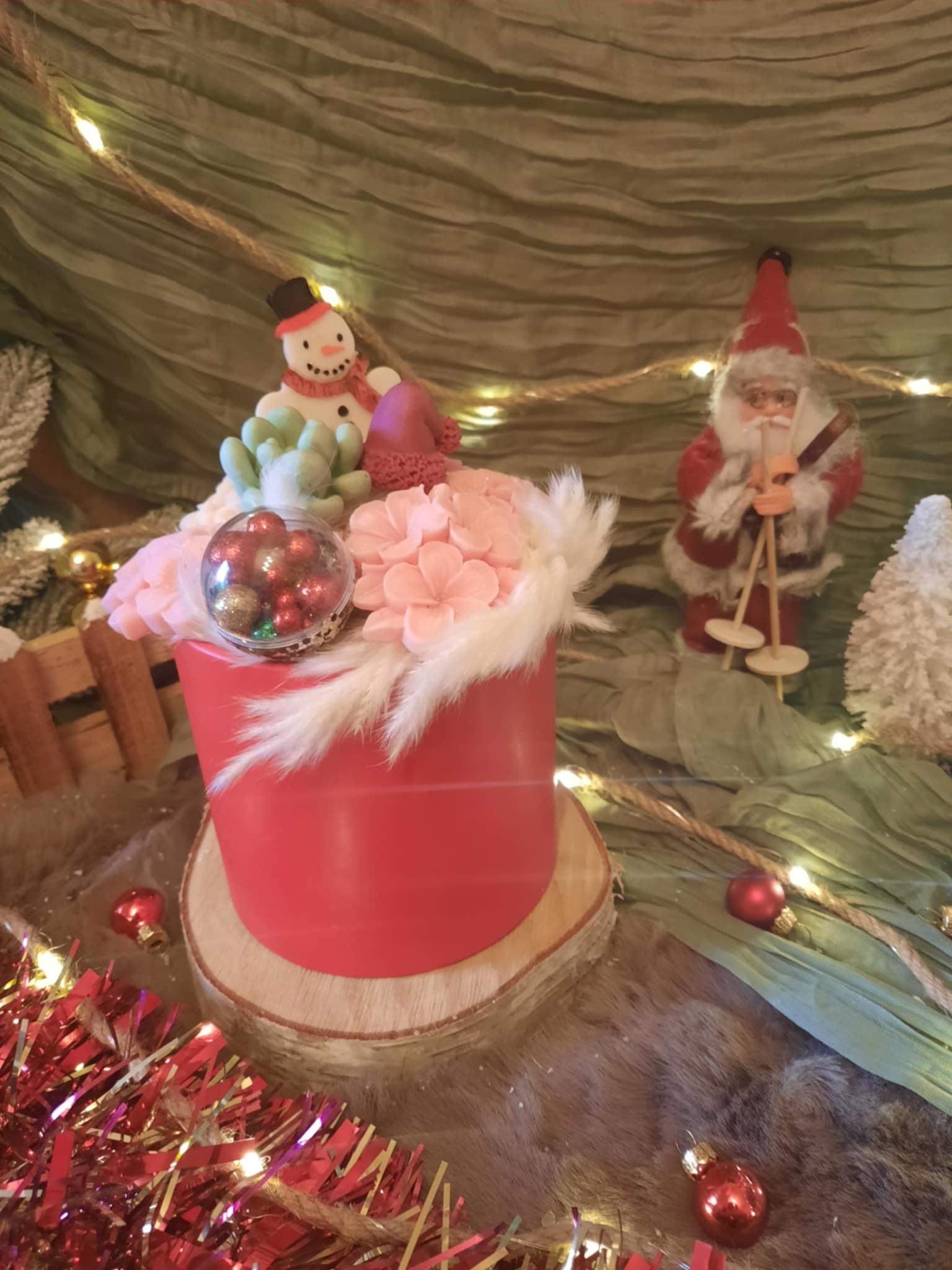 Composition florale de Noël aux teintes festives et intemporelles magnifiquement sublimé dans son contenant rouge.
