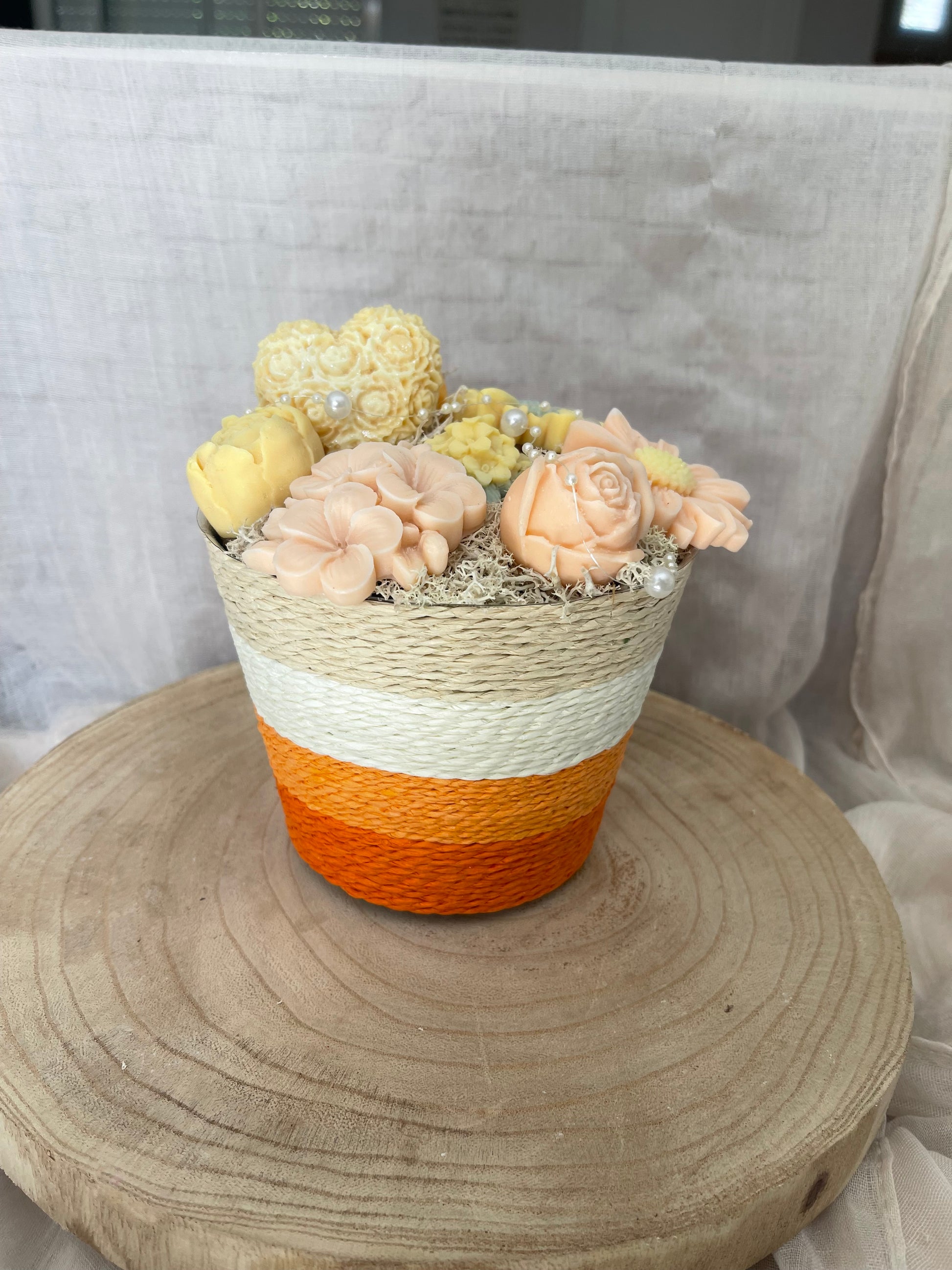 Avec son contenant élégant, ses couleurs chaleureuses et sa décoration ornée de pelle ajoutera une touche de délicatesse et d'élégance à n'importe quel espace. Profitez d'une ambiance parfumée grâce à cette création unique.