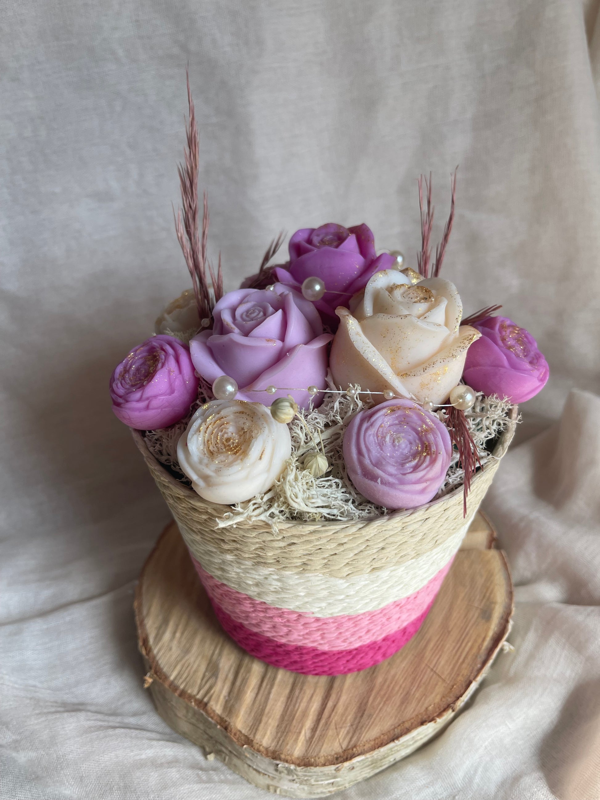 Son joli panier rose et blanc orné de fleurs de cires , de perles et de fleurs séchées dans les tons nuances de rose et blanc , apportera une touche stylée à votre intérieur. Un cadeau idéal pour les amateurs de déco, offrant à la fois élégance et parfums envoûtants.