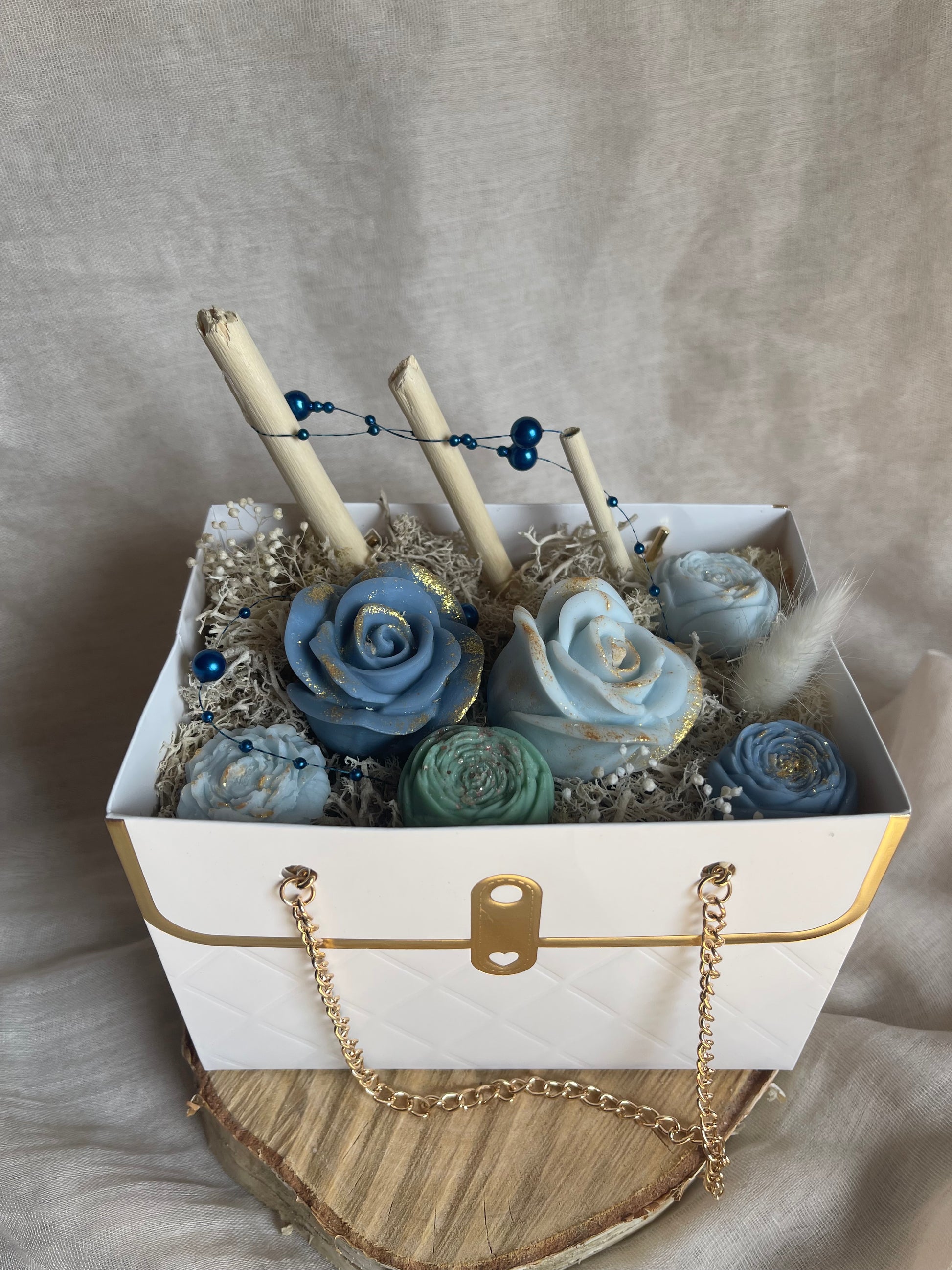 So joli sac blanc et ses décorations de cires dans les tons de bleu et blanc , apportera une touche stylée à votre intérieur.