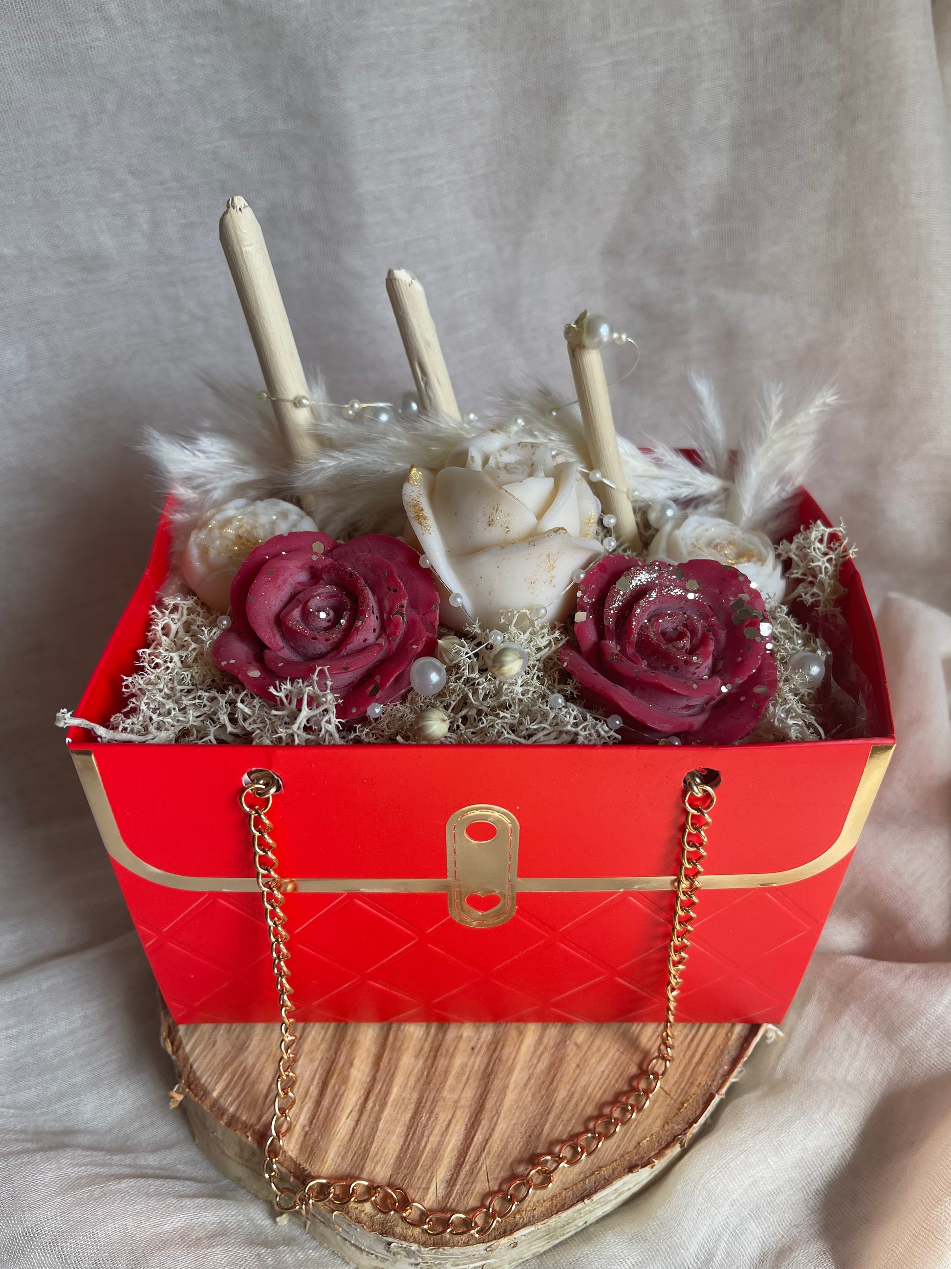 Son joli sac à main rouge orné de magnifiques rose de cires dans les tons rouge et blanc , agrémenté de bambous de perles et de fleurs séchées esprit plumes , apportera une touche stylée à votre intérieur.
