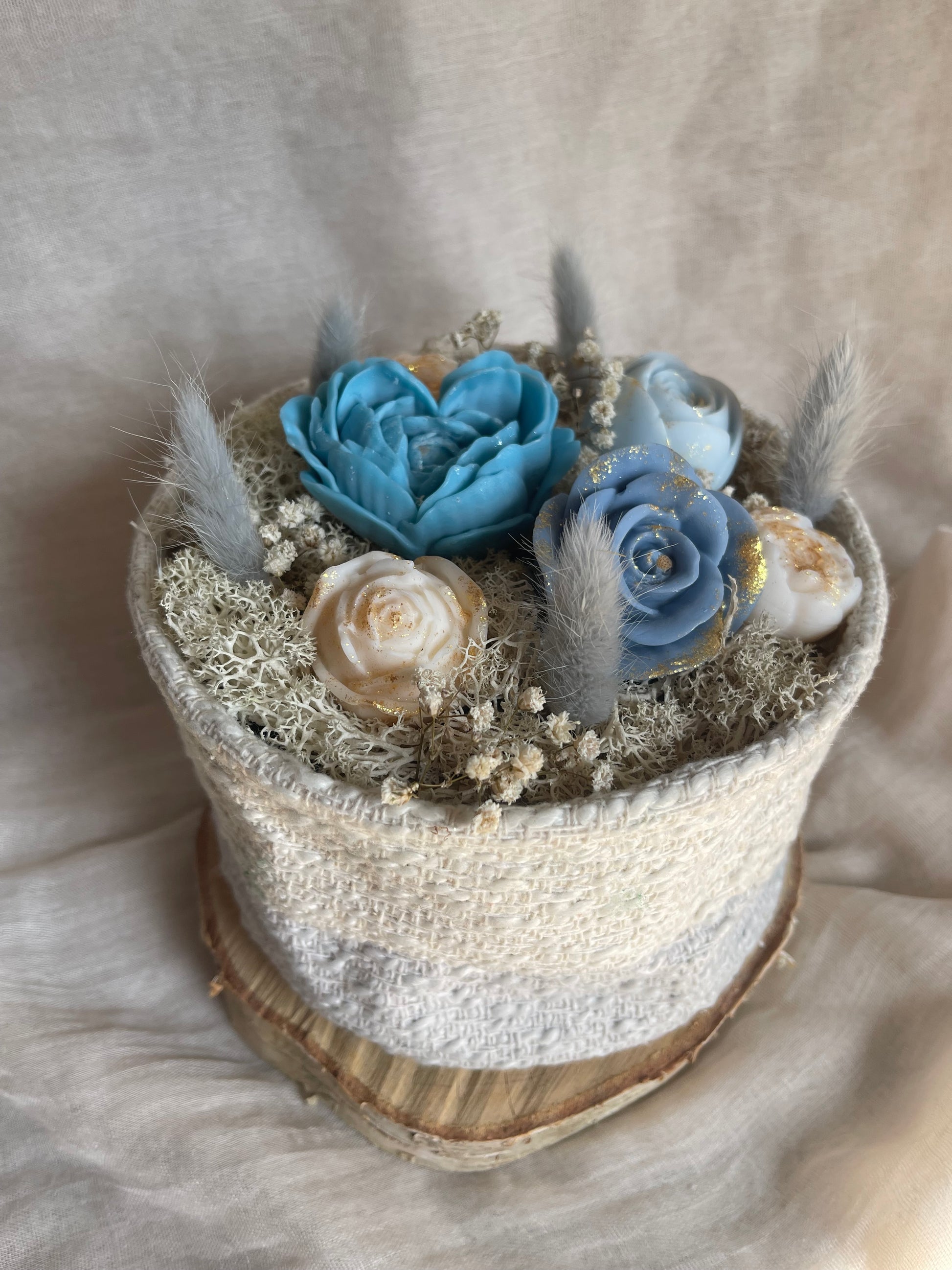 Son joli contenant dans les tons de crème et gris clair est sublimé avec ses fleurs de cire aux couleurs étincelante de bleu , bleu nuit et blanc .
