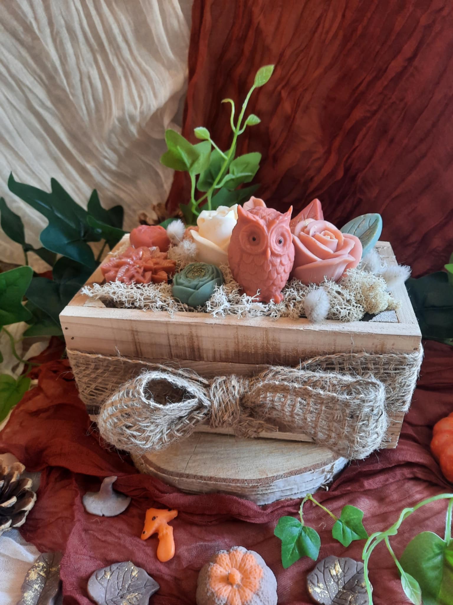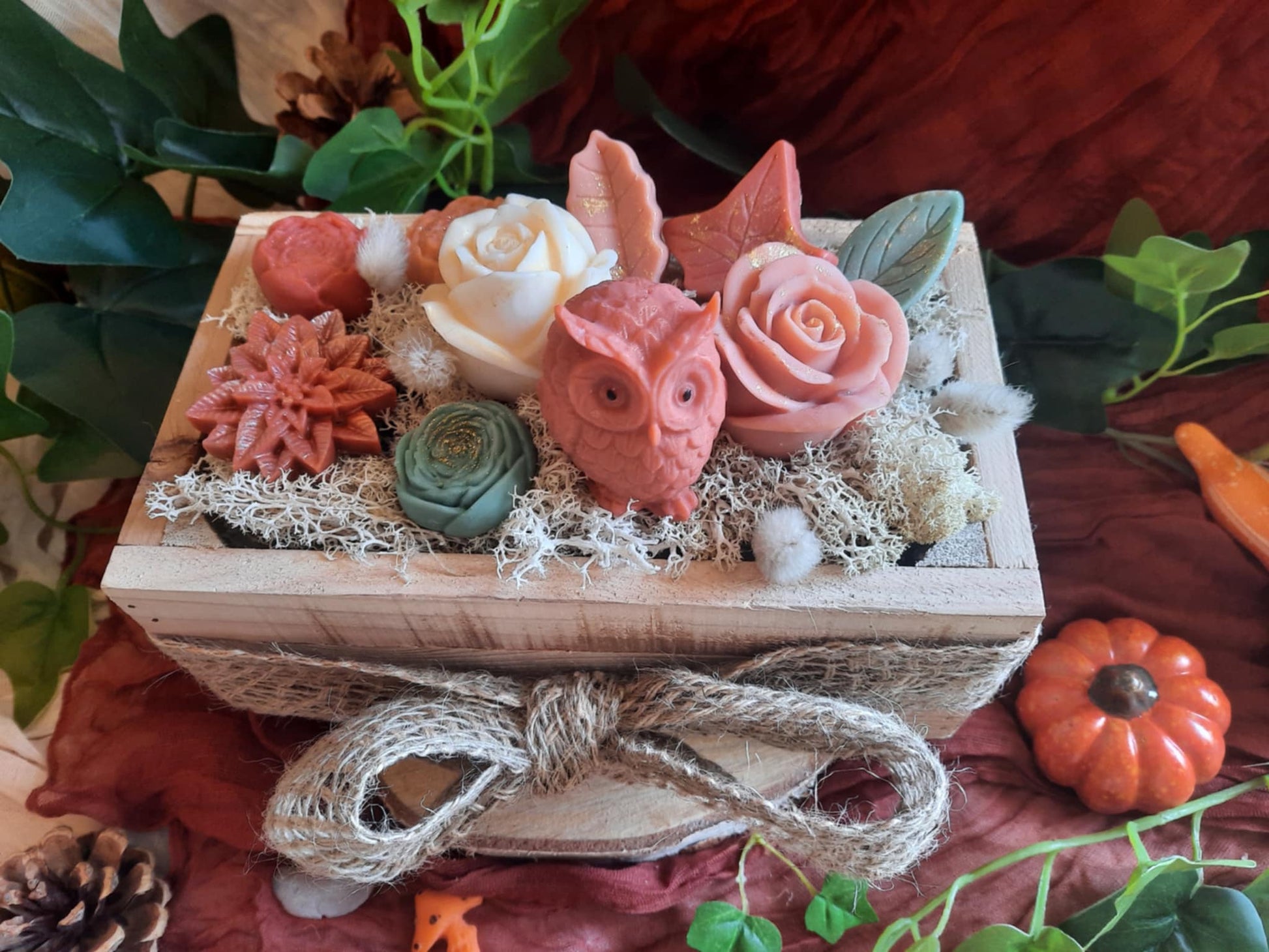 Cette composition florale associe des fondants de cire parfumés aux nuances chaudes et aux décors typiques de l’automne. Conçue avec soin, elle diffuse délicatement des senteurs qui évoquent la saison, tout en apportant une esthétique harmonieuse à votre intérieur. Idéale pour une atmosphère cosy et élégante, elle sublime votre décoration avec une touche naturelle et raffinée.