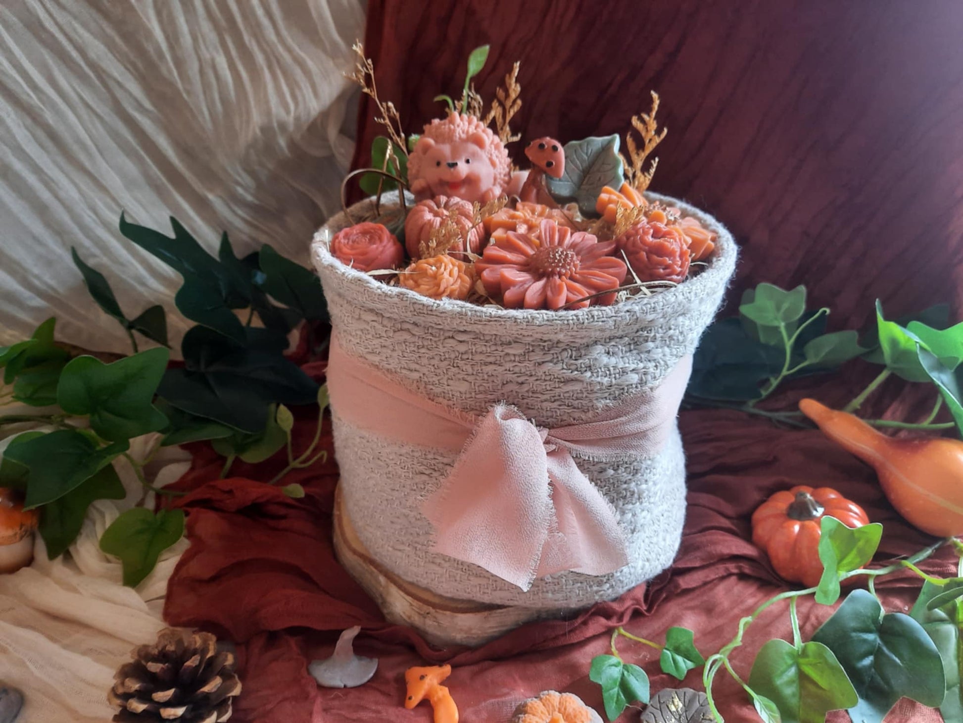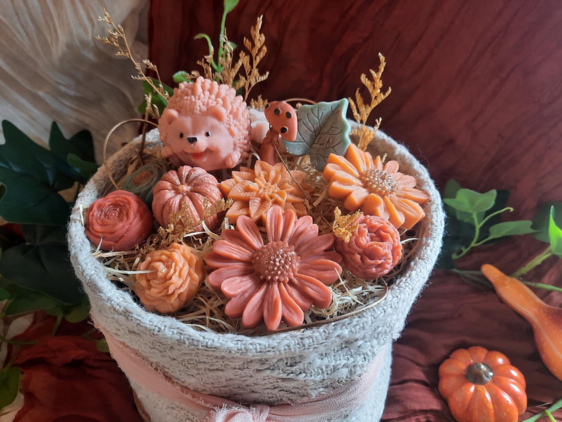 Cette composition florale associe des fondants de cire parfumés aux nuances chaudes et aux décors typiques de l’automne. Conçue avec soin, elle diffuse délicatement des senteurs qui évoquent la saison, tout en apportant une esthétique harmonieuse à votre intérieur. Idéale pour une atmosphère cosy et élégante, elle sublime votre décoration avec une touche naturelle et raffinée.