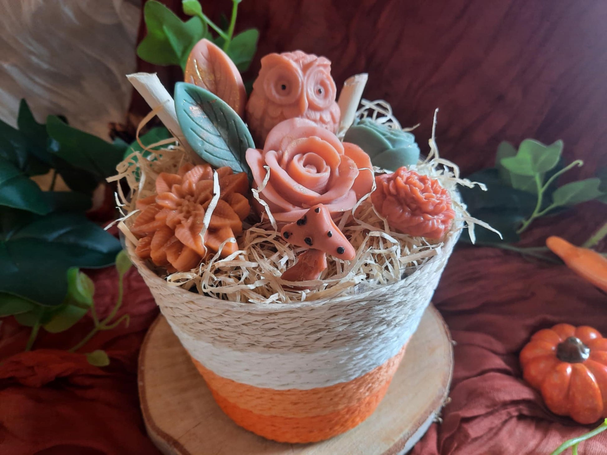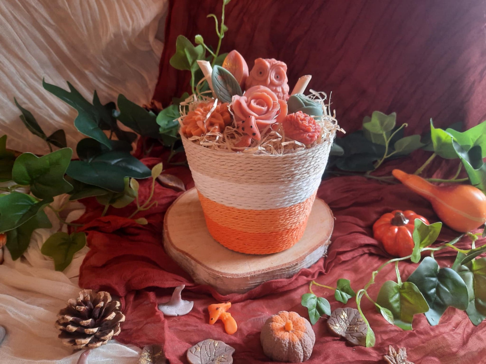 Ce panier en osier moyen modèle aux nuances orangées, sublimé par des décors délicats, accueille des fondants de cire parfumés inspirés de la douceur automnale.