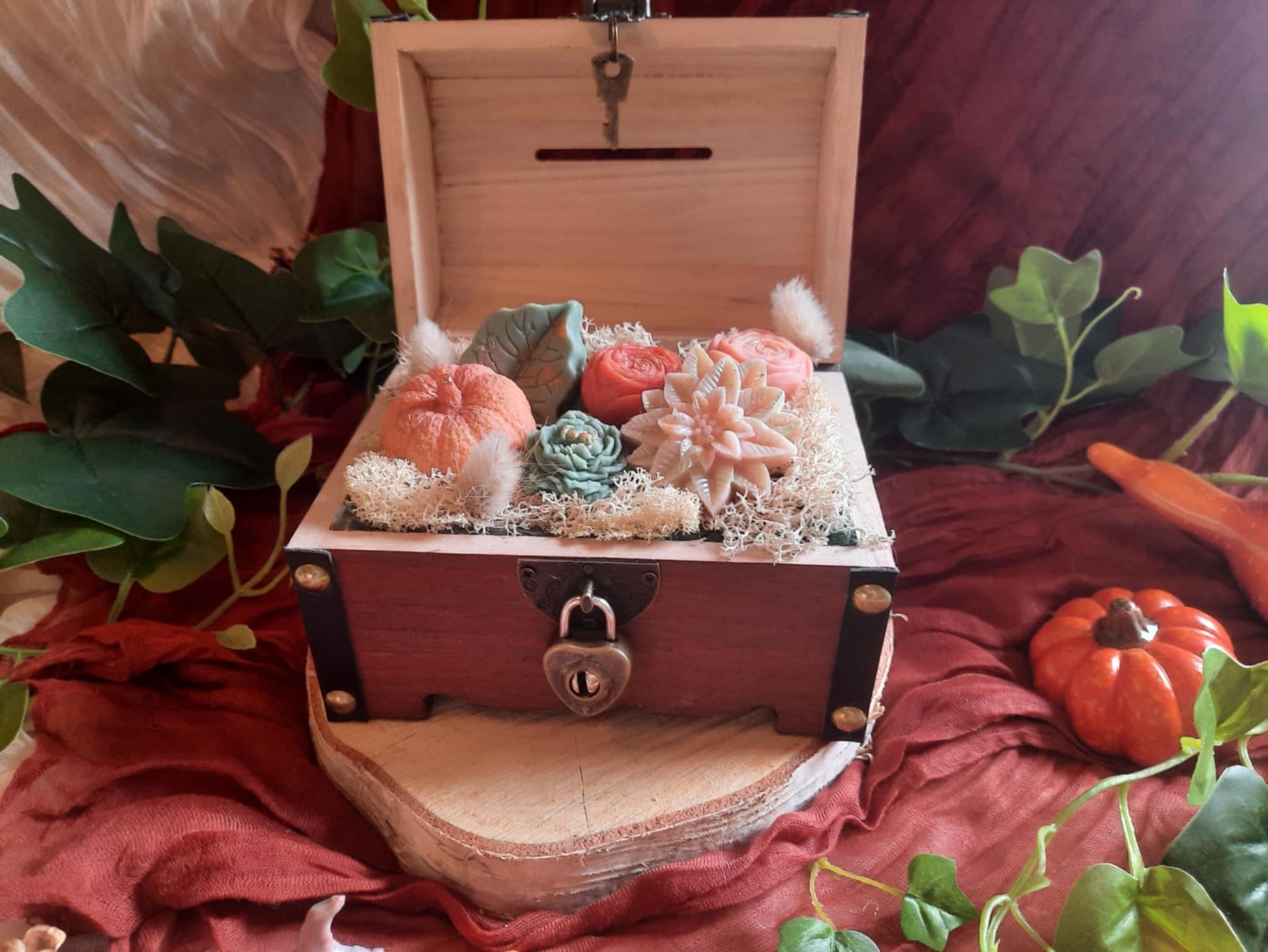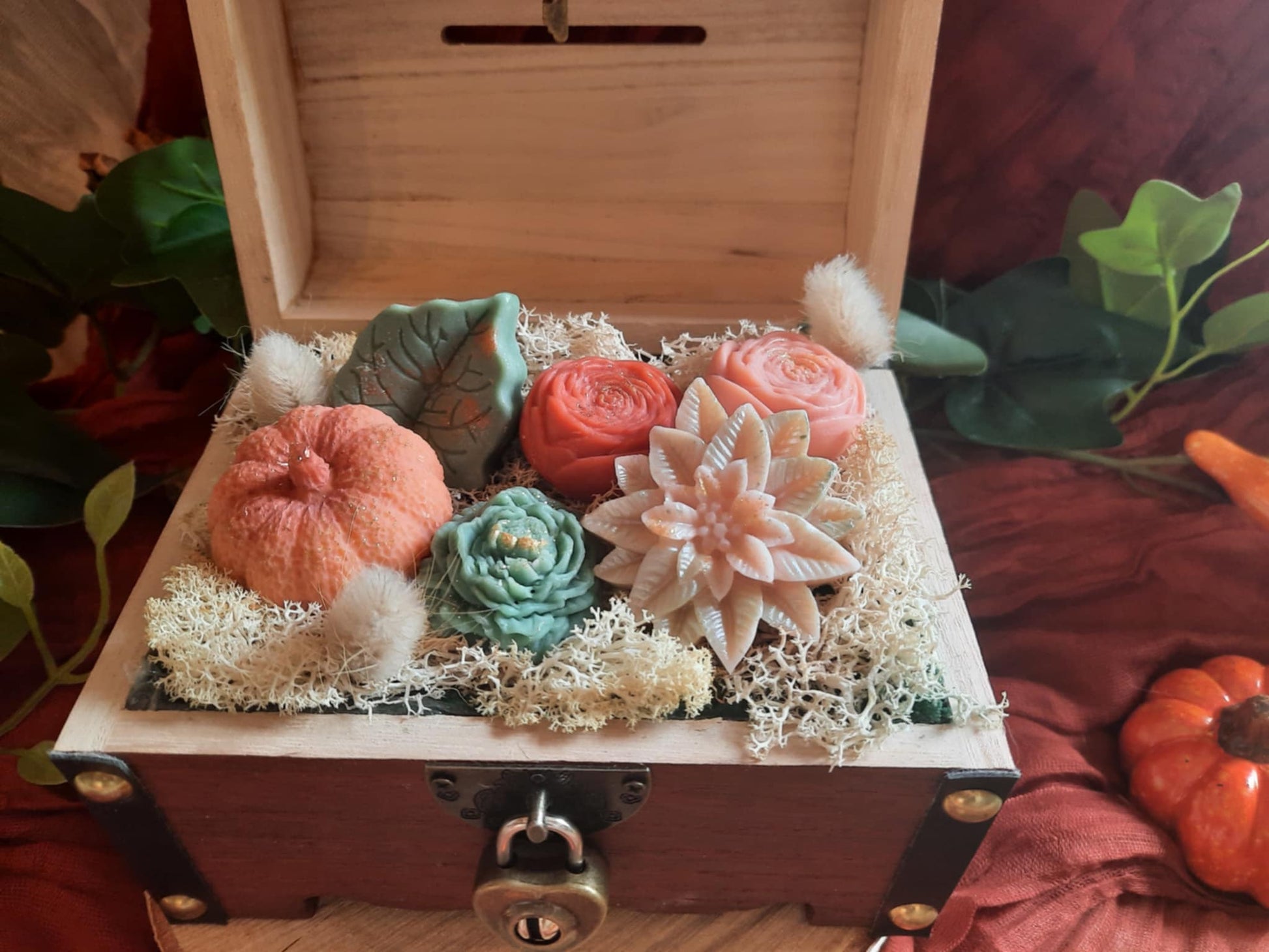 Elle réunit délicatement des fondants de cire parfumés aux senteurs chaleureuses, sublimés dans son joli coffre-fort robuste aux nuances chatoyantes de saison. Idéale pour prolonger l’ambiance automnale dans votre intérieur, cette création allie esthétisme et parfum subtil, alliant qualité et raffinement pour une expérience sensorielle sophistiquée.
