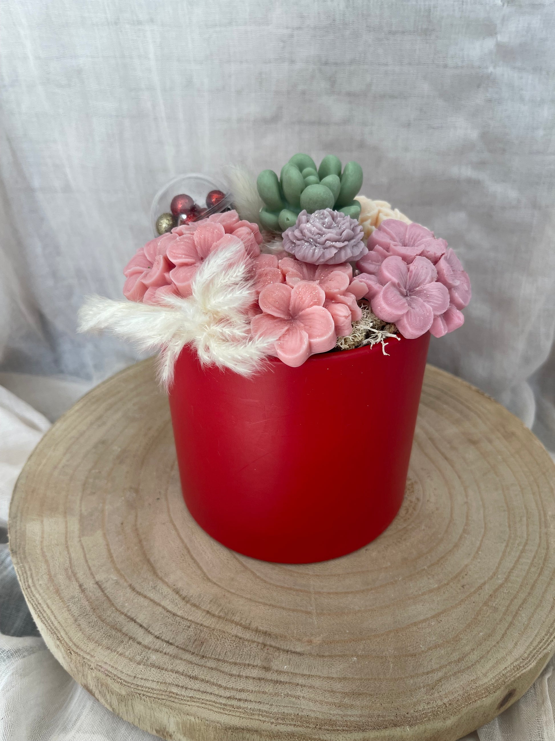 Cette jolie composition florale parfumée avec ses fleurs et cactus de cire au douces couleurs de vieux rose et vert eucalyptus apporteront une touche élégante à n'importe quelle pièce.