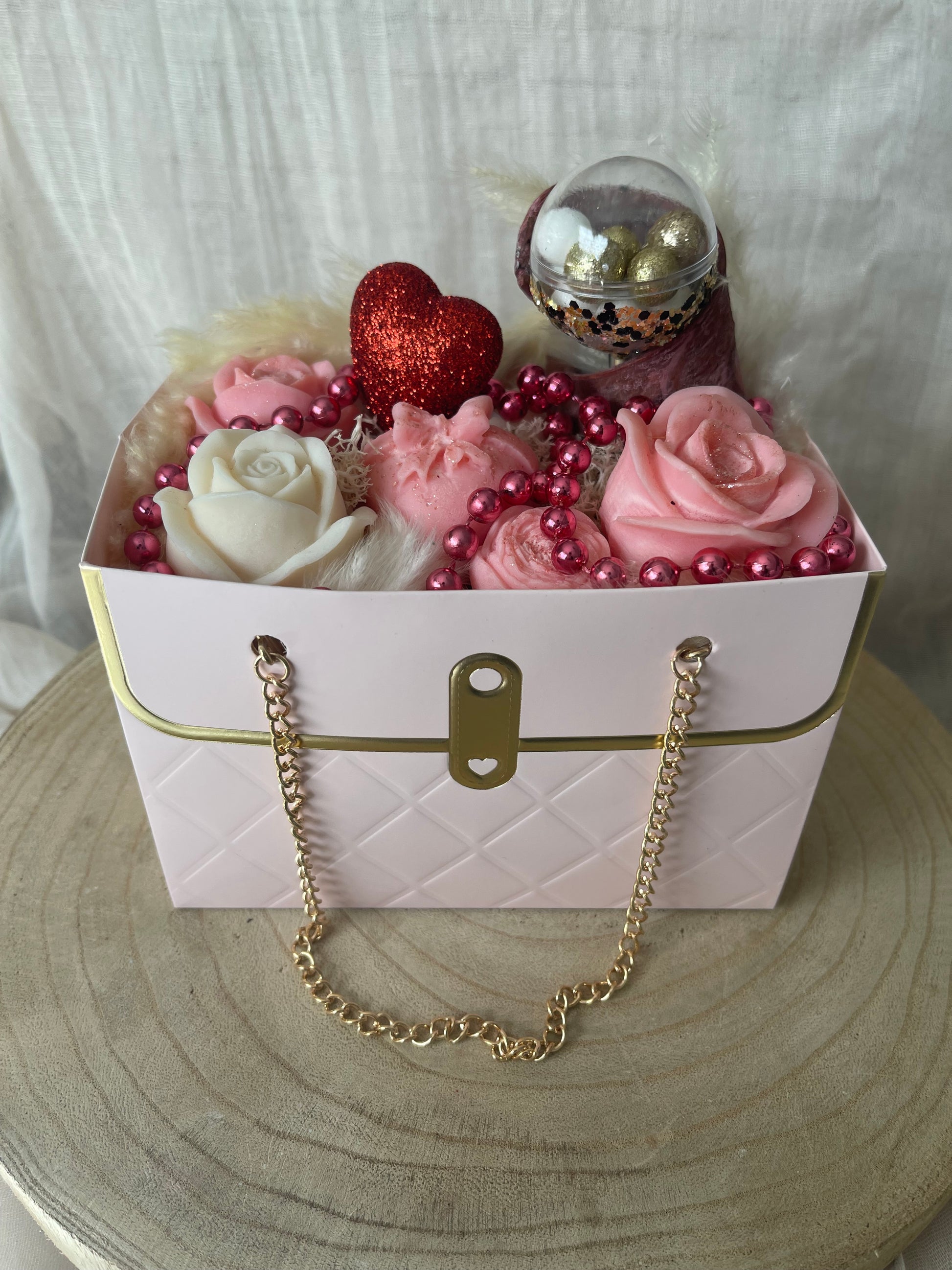 Son joli sac rose et décorée dans les tons rose et rouge et blanc vous charmerons , elle apportera une touche stylée à votre intérieur.