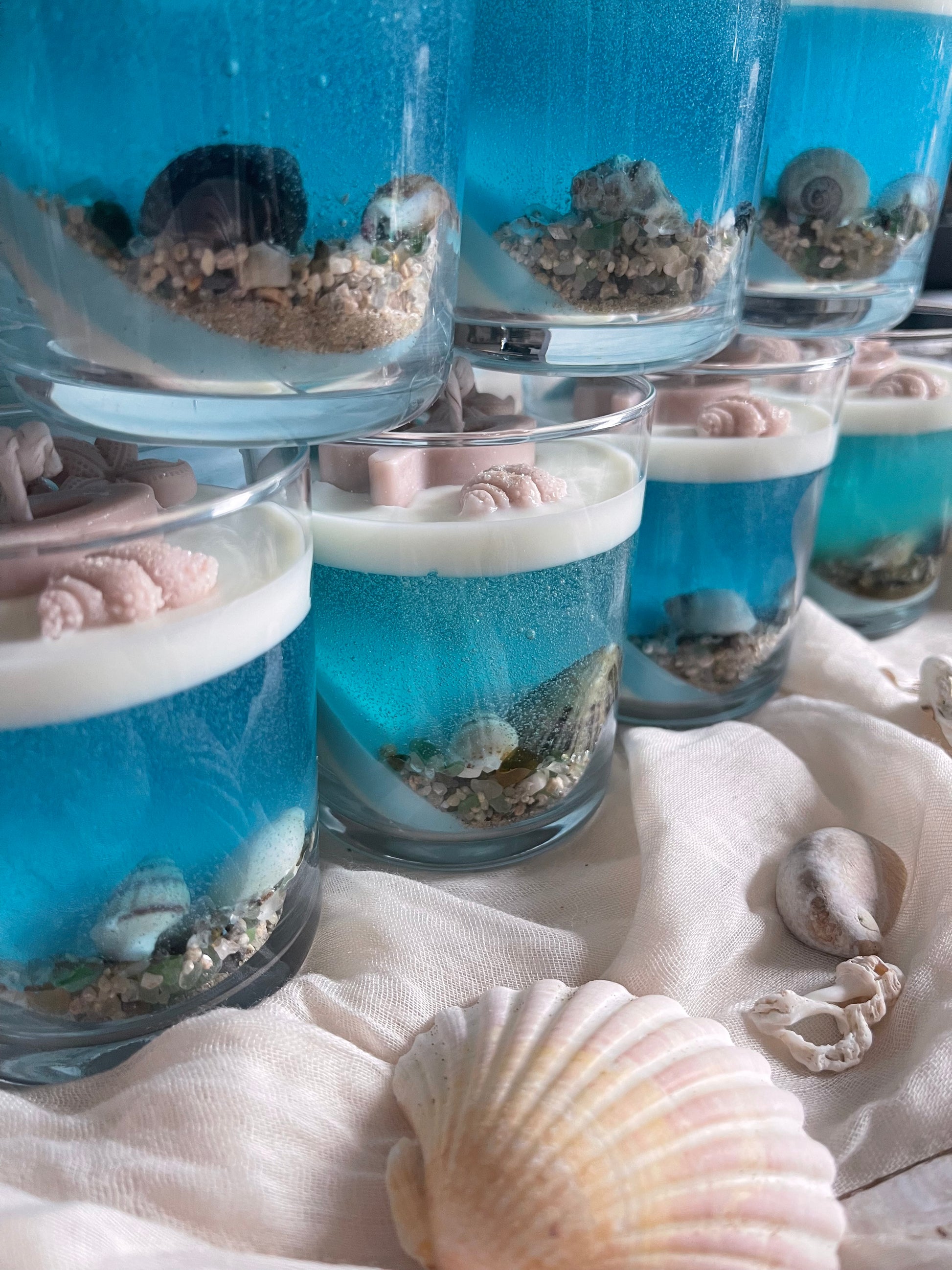 Somptueuse bougie sur le thème marin avec ses coquillages naturels et son sable qui vous transporte avec son parfum Monoï qui lui va comme un gant.