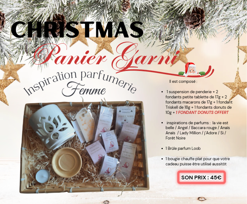 Offrez un cadeau d’exception avec ce panier garni , composé de fondants parfumés + d'une suspension pour parfumer votre dressing et d’un brûle-parfum élégant.