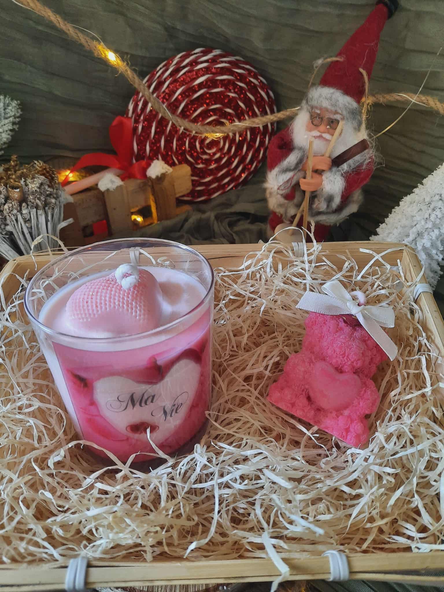 Découvrez notre Panier garni n°18, une sélection raffinée composée d'une bougie de 240g aux inspirations des grands parfumeurs* , complétée par une bougie moulée décorative nounours de 55g aux notes féminines délicates.