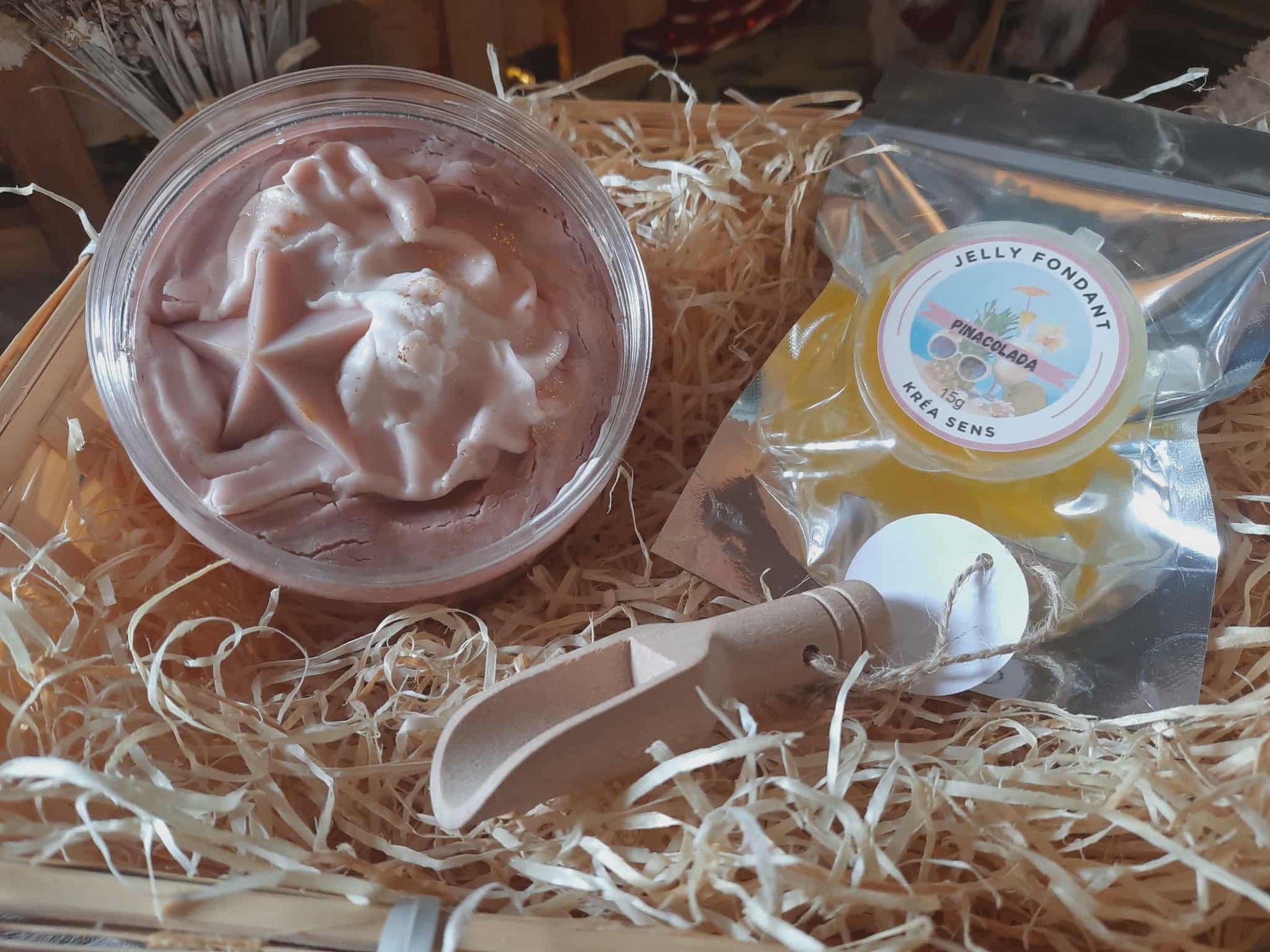 Découvrez une nouvelle dimension des fondants parfumés avec ce panier garni soigneusement composé. Il réunit un fondant chantilly de 150g aux notes exotiques de vanille des îles, offrant une expérience olfactive douce et enveloppante, complété par un mini fondant Jelly de 15g au parfum intensifié de Pinacolada. la cuillère en bois sera votre alliée pour prélever vos fondants et les disposer dans votre brûle parfum