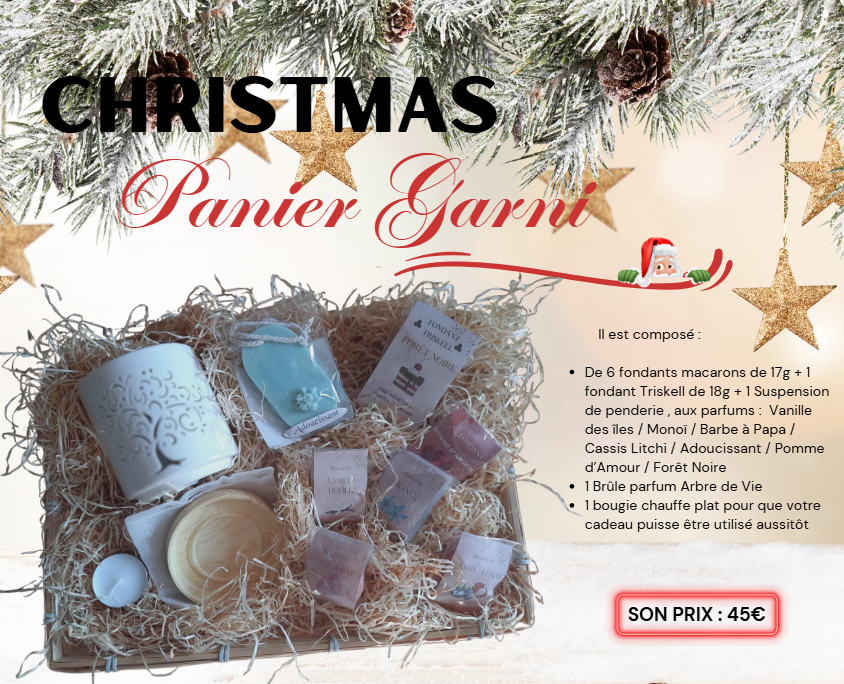 Offrez un panier garni spécialement conçu pour les amateurs de fondants parfumés. Chaque composition associe plusieurs fragrances envoûtantes, accompagnées d’un brûle-parfum charmant, parfait pour créer une ambiance chaleureuse. Ce cadeau raffiné ravira vos proches et apportera une touche délicate sous le sapin.